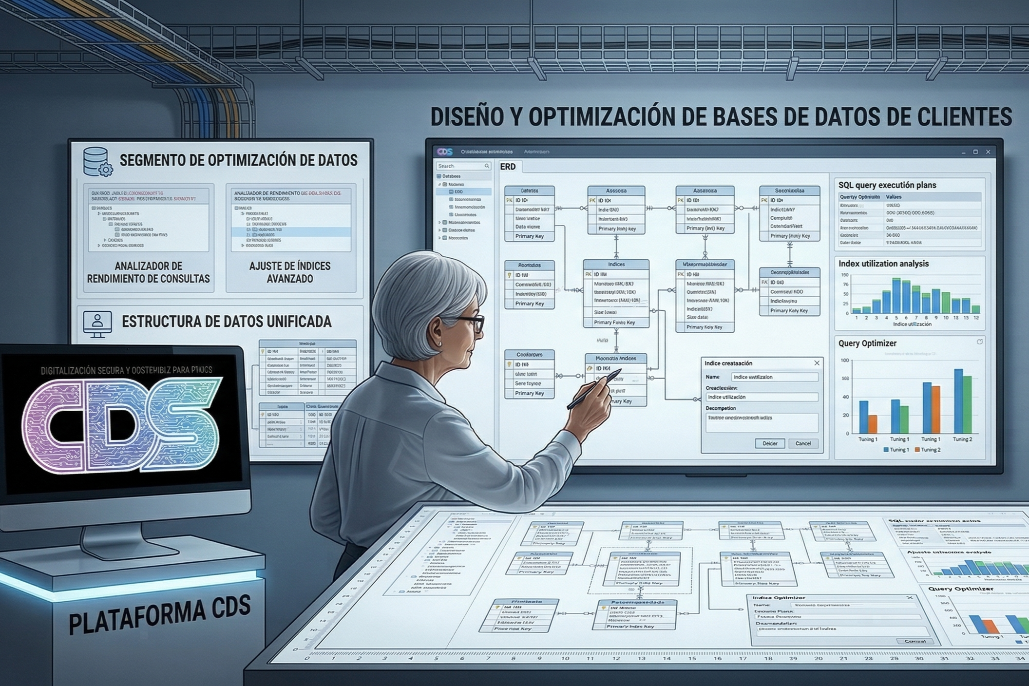 Diseñamos y optimizamos estructuras de bases de datos orientadas a mejorar la gestión de la información empresarial. Una correcta organización de los datos permite agilizar procesos internos, reducir errores y facilitar el acceso seguro a la información necesaria para la actividad diaria del negocio.